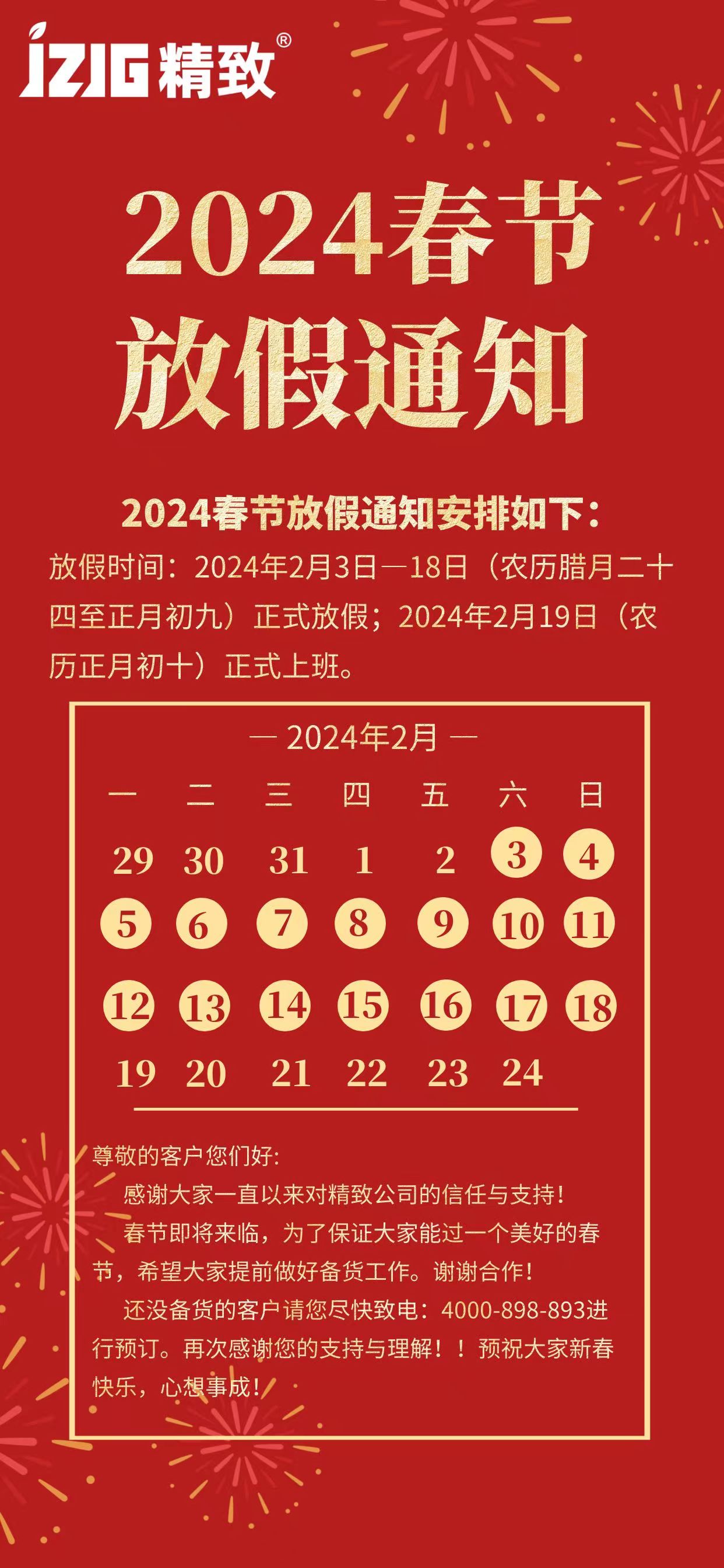 放假時(shí)間: 2024年2月3日一18日 (農(nóng)歷臘月二十四至正月初九) 正式放假;2024年2月19日 (農(nóng)歷正月初十) 正式上班。